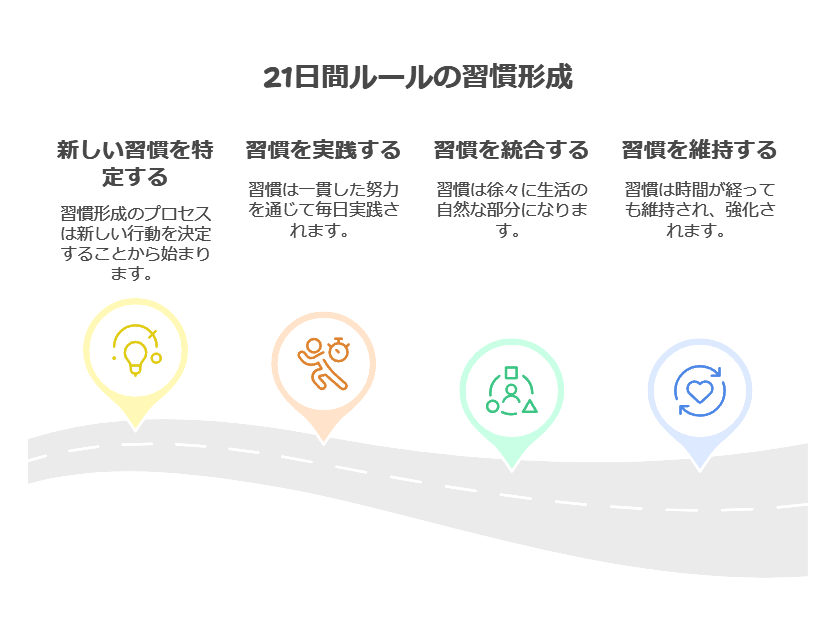 21日間の法則」はあくまで目安ですが、短期間で区切ることで「とりあえずやってみよう」という気持ちになりやすいのです。さらに、「3週間なら頑張れそう」と感じる人も多く、実際に続けていくうちに自然と行動が習慣化されます。