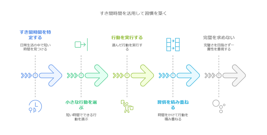 また、すき間時間を活用するのも効果的です。移動中や休憩時間にスマホで英単語を一つ覚える、待ち時間に深呼吸をする、朝の支度中にストレッチを取り入れるなど、短時間の行動でも積み重ねれば立派な習慣になります。重要なのは「完璧を求めないこと」です。忙しい日は1分だけでも行動すればOKと決めておけば、途中で挫折しにくくなります。