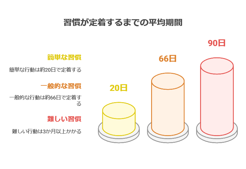ロンドン大学の研究では、習慣が定着するまでの平均期間は66日とされています。一方で、簡単な行動なら20日程度で身につく場合もあると報告されています。例えば、「毎日水を一杯飲む」習慣は数週間で定着しやすいですが、「週3回の筋トレ」を習慣にするには3か月以上かかることもあります。